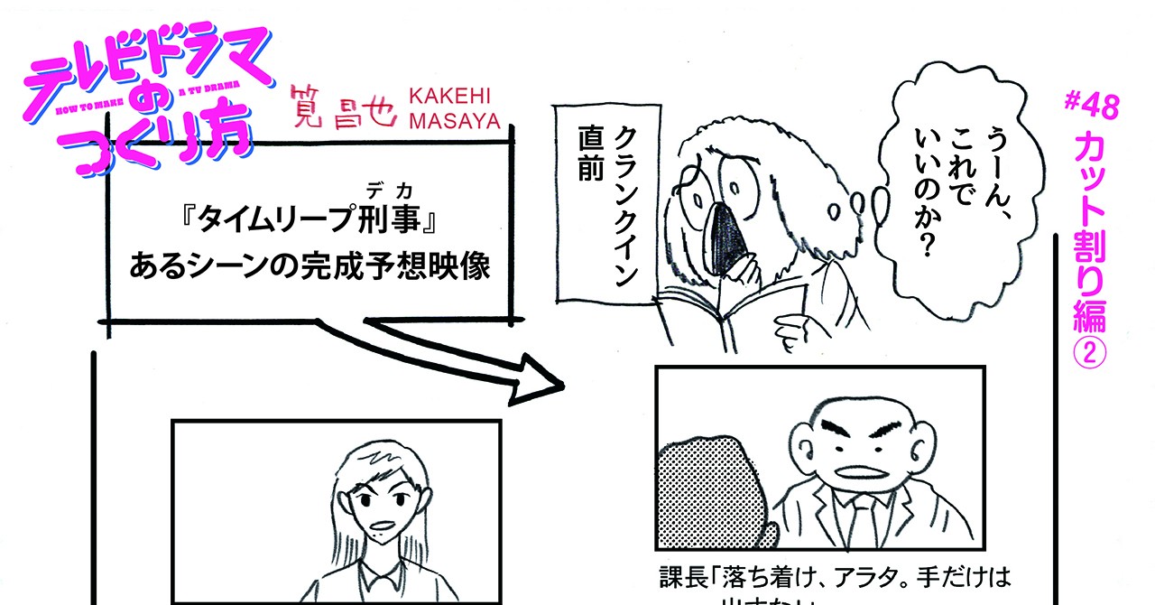 #48「ドラマ監督のリアルな台本とは…カット割り編②」|マンガ『テレビドラマのつくり方』筧昌也マンガ『テレビドラマのつくり方』筧昌也 もっとドラマが楽しめる? 映画・ドラマ監督/脚本家の筧昌也が描く、テレビドラマづくりの裏側、こだわり、人間模様—— <前の話に戻る